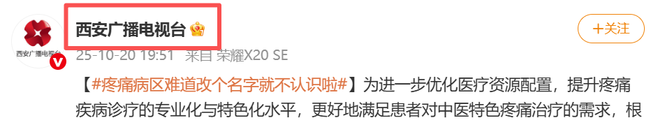 【#疼痛病区难道改个名字就不认识啦#】为进一步优化医疗资源配置,提升疼痛疾病诊疗的专业化与特色化水平,更好地满足患者对中医特色疼痛治疗的需求,根据医院机构调整规划,原康复医院疼痛病区正式更名为@西安市红会医院官微 中医药特色诊疗中心中医疼痛科。科室更名后,诊疗…