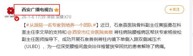 【#从派驻一名专家到培养一个团队#】近日,石泉县医院骨科副主任黄振勇在科室主任李文早的支持和@西安市红会医院官微 脊柱病院腰椎病区帮扶专家杨俊松副主任医师指导下,成功开展石泉首例脊柱内镜下单侧入路双侧减压术(ULBD),为一位深受腰椎间盘突出伴椎管狭窄困扰的患者解…