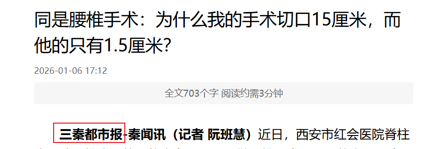 三秦都市报-秦闻讯(记者 阮班慧)近日,西安市红会医院脊柱病医院腰椎病区的两位患者,同一天做腰椎手术、同一位主刀医生,术后换药时却出现了15厘米与1.5厘米的切口差距。家属的这一“灵魂拷问”,揭开了脊柱外科开放手术与微创手术的选择奥秘。据主管医生郭磊副主任医师、李…