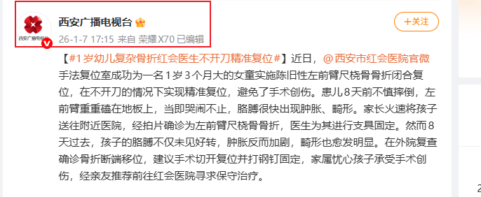 【#1岁幼儿复杂骨折红会医生不开刀精准复位#】近日,@西安市红会医院官微 手法复位室成功为一名1岁3个月大的女童实施陈旧性左前臂尺桡骨骨折闭合复位,在不开刀的情况下实现精准复位,避免了手术创伤。患儿8天前不慎摔倒,左前臂重重磕在地板上,当即哭闹不止,胳膊很快出现肿…
