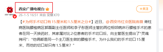 【#为何手术切口有15厘米和1.5厘米之分#】近日,@西安市红会医院官微 脊柱病医院腰椎病区郭磊副主任医师和李子彤医师主管的两位相邻病床行腰椎手术的患者在同一天换药时,其家属对比2位患者的手术切口后,向主管医生提出了“灵魂拷问”:“他俩都是同一个主刀医生做的腰椎手术…