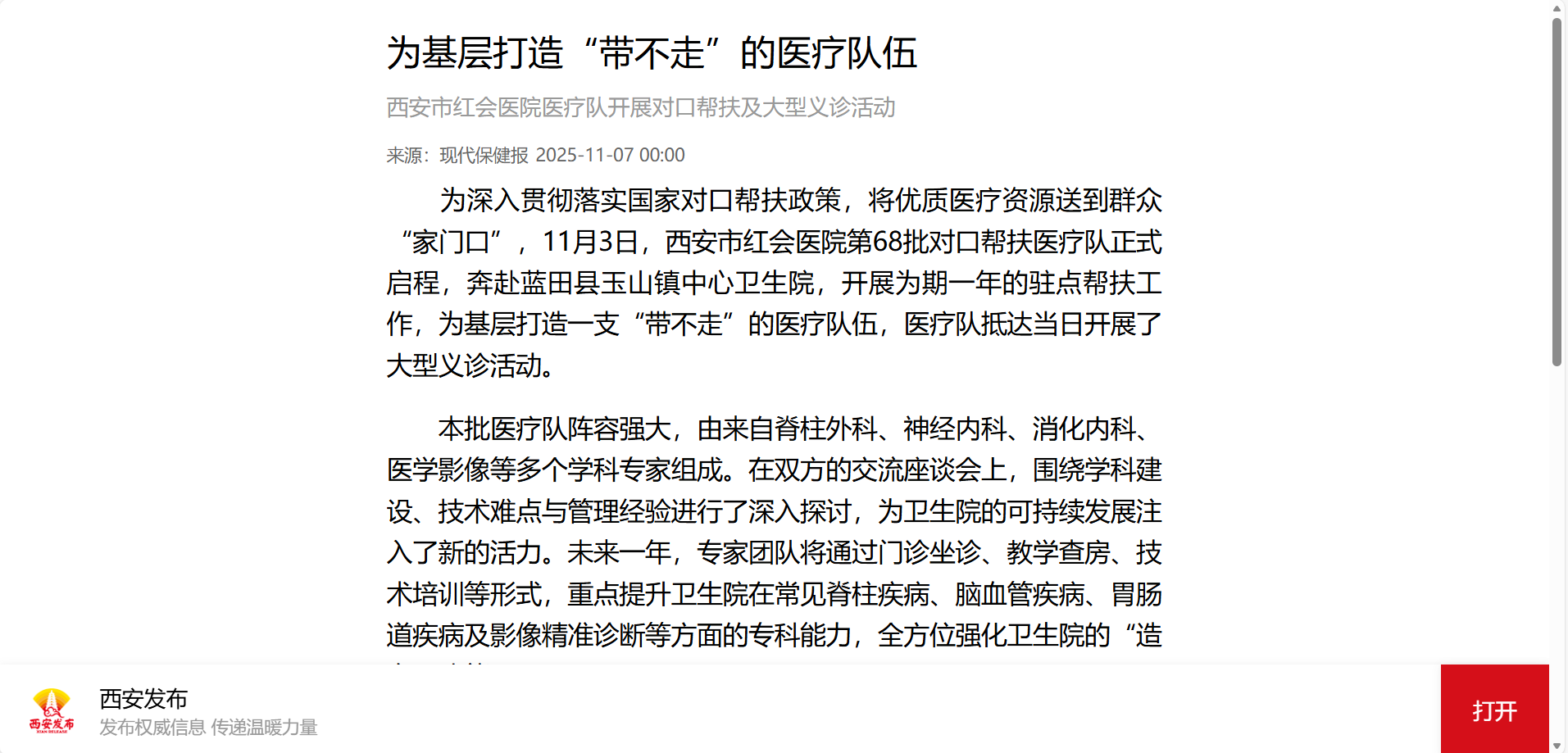 为深入贯彻落实国家对口帮扶政策,将优质医疗资源送到群众“家门口”,11月3日,西安市红会医院第68批对口帮扶医疗队正式启程,奔赴蓝田县玉山镇中心卫生院,开展为期一年的驻点帮扶工作,为基层打造一支“带不走”的医疗队伍,医疗队抵达当日开展了大型义诊活动。本批医疗队阵…