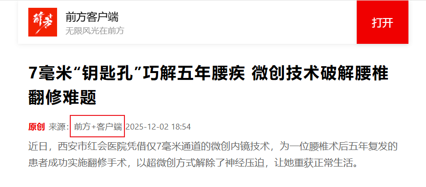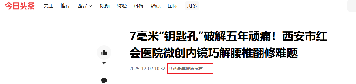近日,西安市红会医院脊柱病医院微创病区在闫亮副院长及王晓东主任的带领下,由胡慧敏主任医师团队成功运用仅7毫米通道的微创内镜技术,为一位腰椎融合内固定术后五年、出现严重邻近节段病变的患者实施了精准的翻修手术,成功解除了其因神经根管严重狭窄导致的剧烈疼痛和功能障…