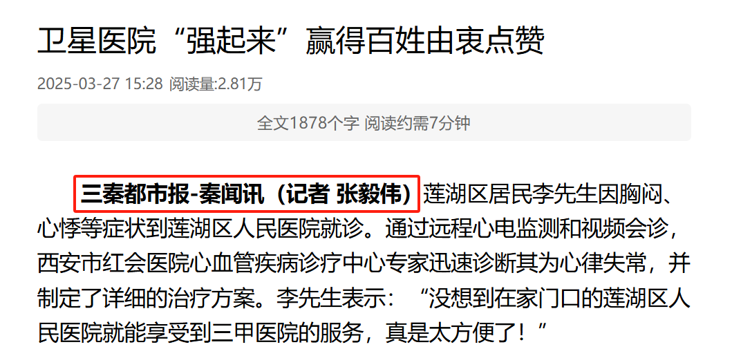 三秦都市报-秦闻讯(记者 张毅伟)莲湖区居民李先生因胸闷、心悸等症状到莲湖区人民医院就诊。通过远程心电监测和视频会诊,西安市红会医院心血管疾病诊疗中心专家迅速诊断其为心律失常,并制定了详细的治疗方案。李先生表示:“没想到在家门口的莲湖区人民医院就能享受到三甲…