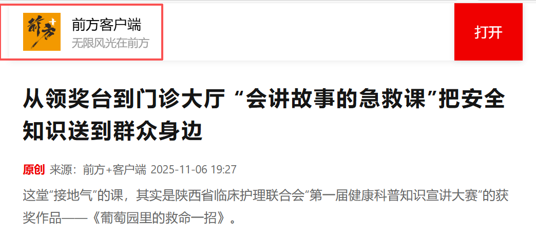 这堂“接地气”的课,其实是陕西省临床护理联合会“第一届健康科普知识宣讲大赛”的获奖作品——《葡萄园里的救命一招》。近日,一场特殊的“健康课堂”在西安市红会医院门诊大厅温情开讲。没有严肃的讲台,没有枯燥的理论,医护人员用情景剧演绎紧急时刻,手把手教大家操作急…