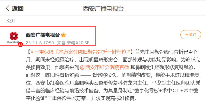 普先生因颧骨颧弓骨折已4个月,期间未经规范治疗,出现明显畸形愈合,面部外观与功能均受影响。为追求完美修复效果,他慕名来到@西安市红会医院官微 耳鼻咽喉头颈整形修复科就诊。面对这一陈旧性骨折难题 —— 骨骼移位久、解剖结构改变,传统手术难以精准复位,西安市红会医院…