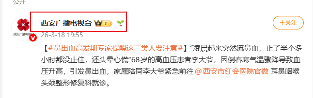 【#鼻出血高发期专家提醒这三类人要注意#】“凌晨起来突然流鼻血,止了半个多小时都没止住,还头晕心慌”68岁的高血压患者李大爷,因倒春寒气温骤降导致血压升高,引发鼻出血,家属陪同李大爷紧急前往@西安市红会医院官微 耳鼻咽喉头颈整形修复科就诊。接诊的刘文军医生为李大…