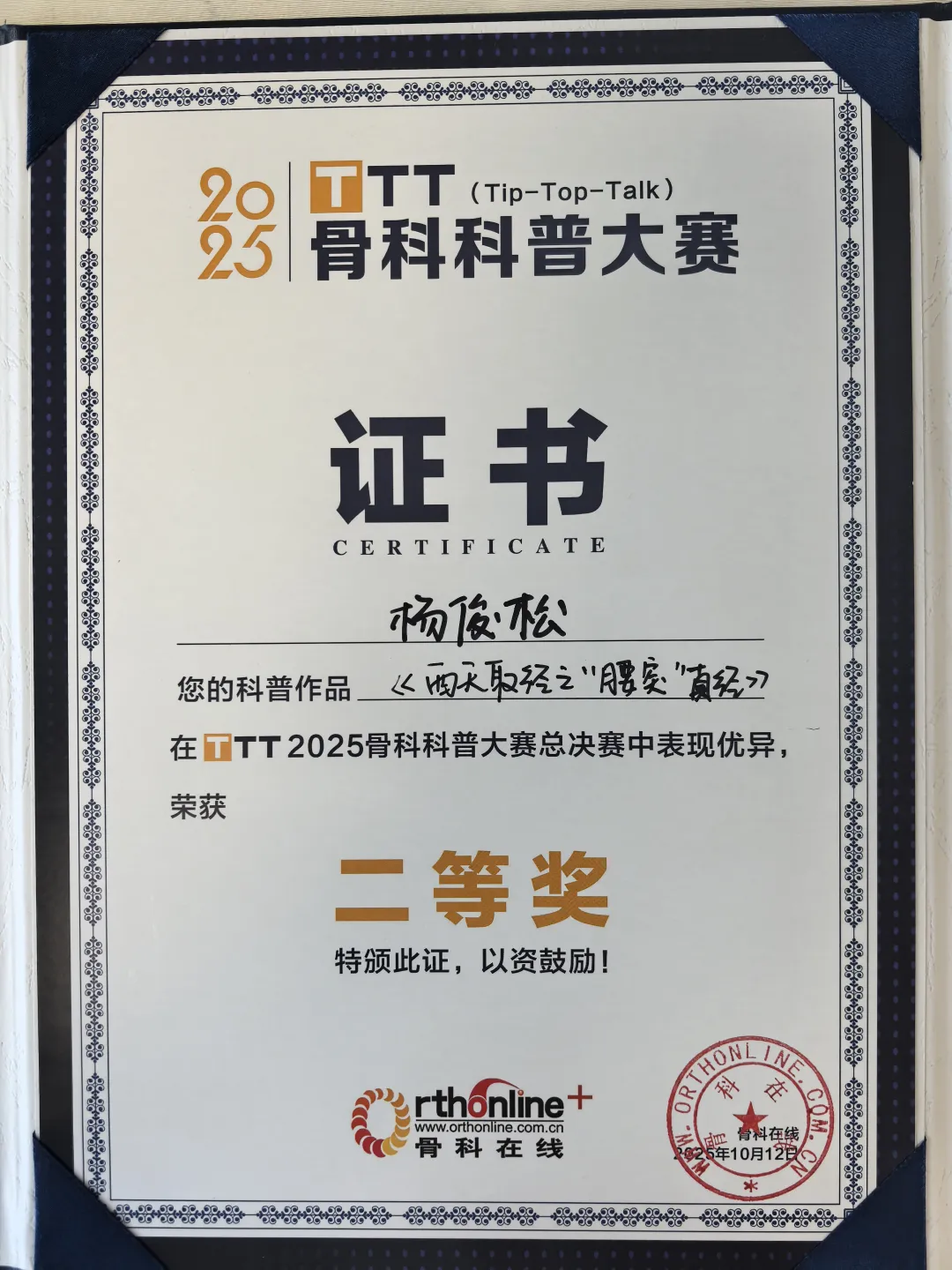 10月12日,在刚刚落幕的骨科在线2025TTT(Tip-Top-Talk)全国骨科科普大赛中,脊柱病院腰椎病区杨俊松副主任医师创作的视频科普作品《西天取经之“腰突”真经》凭借其专业的科普内容与创新的表现形式,通过激烈角逐,历经初赛、复赛、半决赛的层层选拔,从全国众多优秀参赛作品…